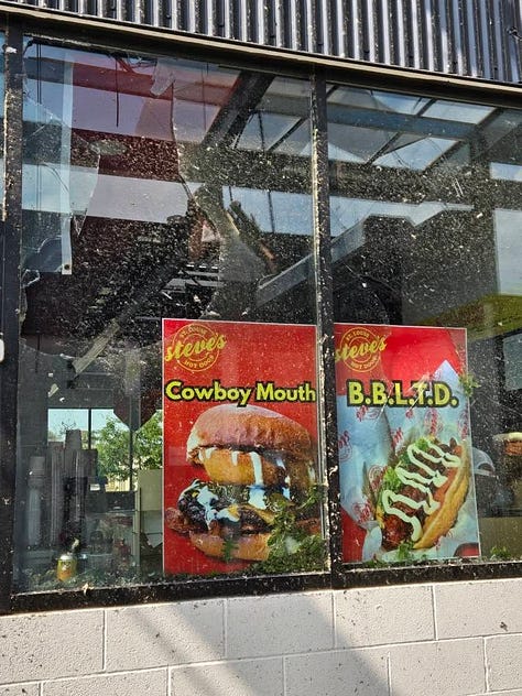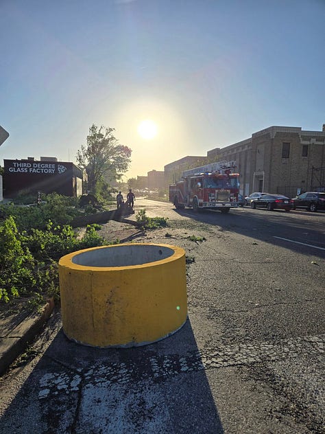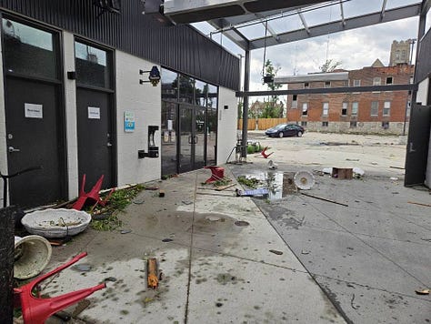 When we finally got near the area, we had to park about 3/4 of a mile away. We abandoned our car and took off on foot - jumping over downed trees, dodging downed wires, a symphony of car alarms, building alarms, crying. As we approached the intersection near our restaurant, I heard “Danni!” and turned around to see my friend covered in glass standing shaken outside of her car that was now missing every window, every tire popped. She’d ridden out the tornado in her car outside our restaurant. It was fully engulfed, totaled. We held each other and cried as my husband took off running to check on our employees.